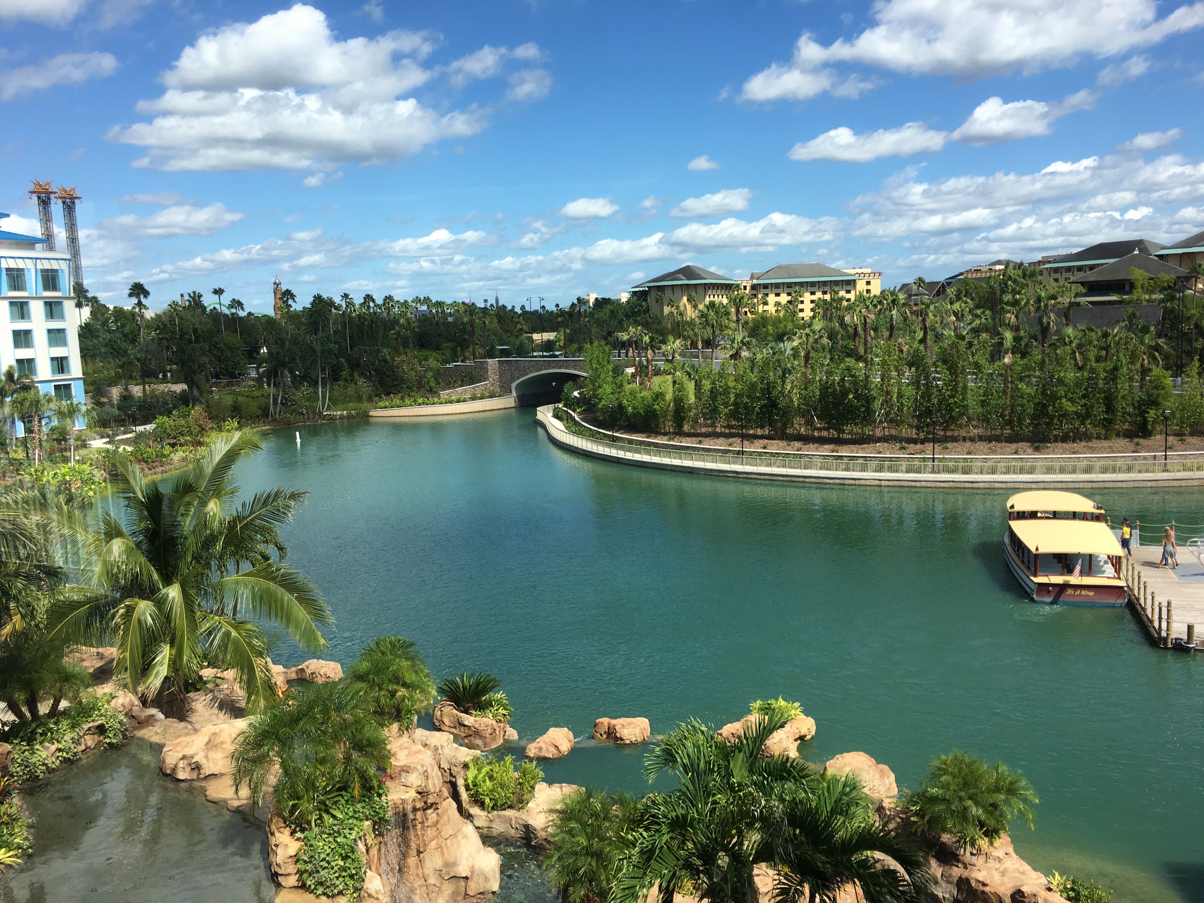 Loews Sapphire Falls Resort at Universal Orlando Resort boasts a stunning resort-style pool, complete with a water slide and surrounded by lush landscaping and cascading waterfalls.